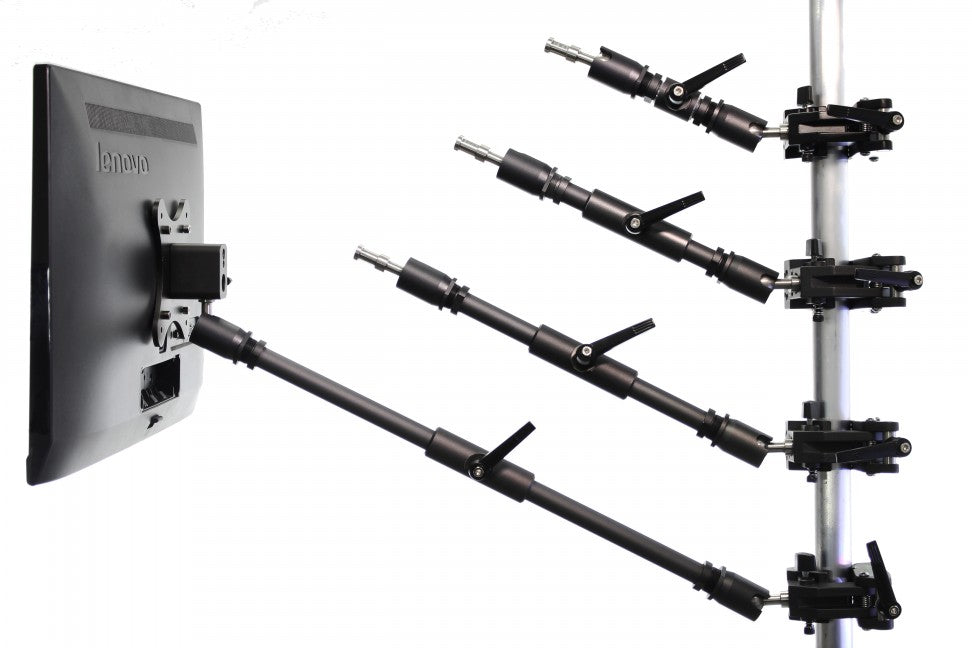 Le bras à double articulation est doté de joints à rotule aux deux extrémités, qui sont bloqués en position par un mécanisme de serrage à un seul point. Chaque joint à rotule est doté d'une broche de 5/8" avec un filetage femelle de 3/8"-16, ce qui facilite le montage et le positionnement des lumières, des caméras, des moniteurs ou d'une grande variété d'équipements à n'importe quel angle.