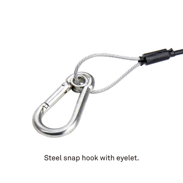 Le câble de sécurité (SW-02) sert de dispositif de protection secondaire pour les suspensions en hauteur, afin d'éviter que des lampes ou du matériel ne tombent accidentellement et ne causent des dommages au personnel ou au matériel. Il est terminé et serti d'une cosse en aluminium pour garantir une fixation solide. Le câble en acier est recouvert de PVC noir pour protéger le luminaire et le support contre les rayures. Capacité de charge : 5 kg (11 lb), certifié CE