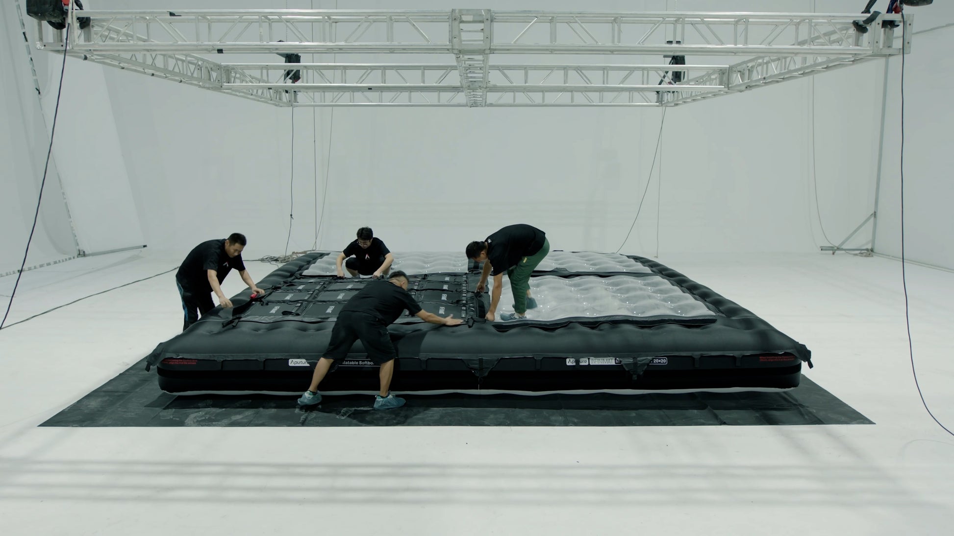 The 20x20 INFINIMAT sets up and breaks down in minutes rather than hours. The kit contains fewer parts compared to traditional large soft box rigs and uses one truss frame instead of two. Since the airbag creates the structure, the 20x20 INFINIMAT is a singular unit when built, so you can even mount it to rolling stands to create a movable wall of light.