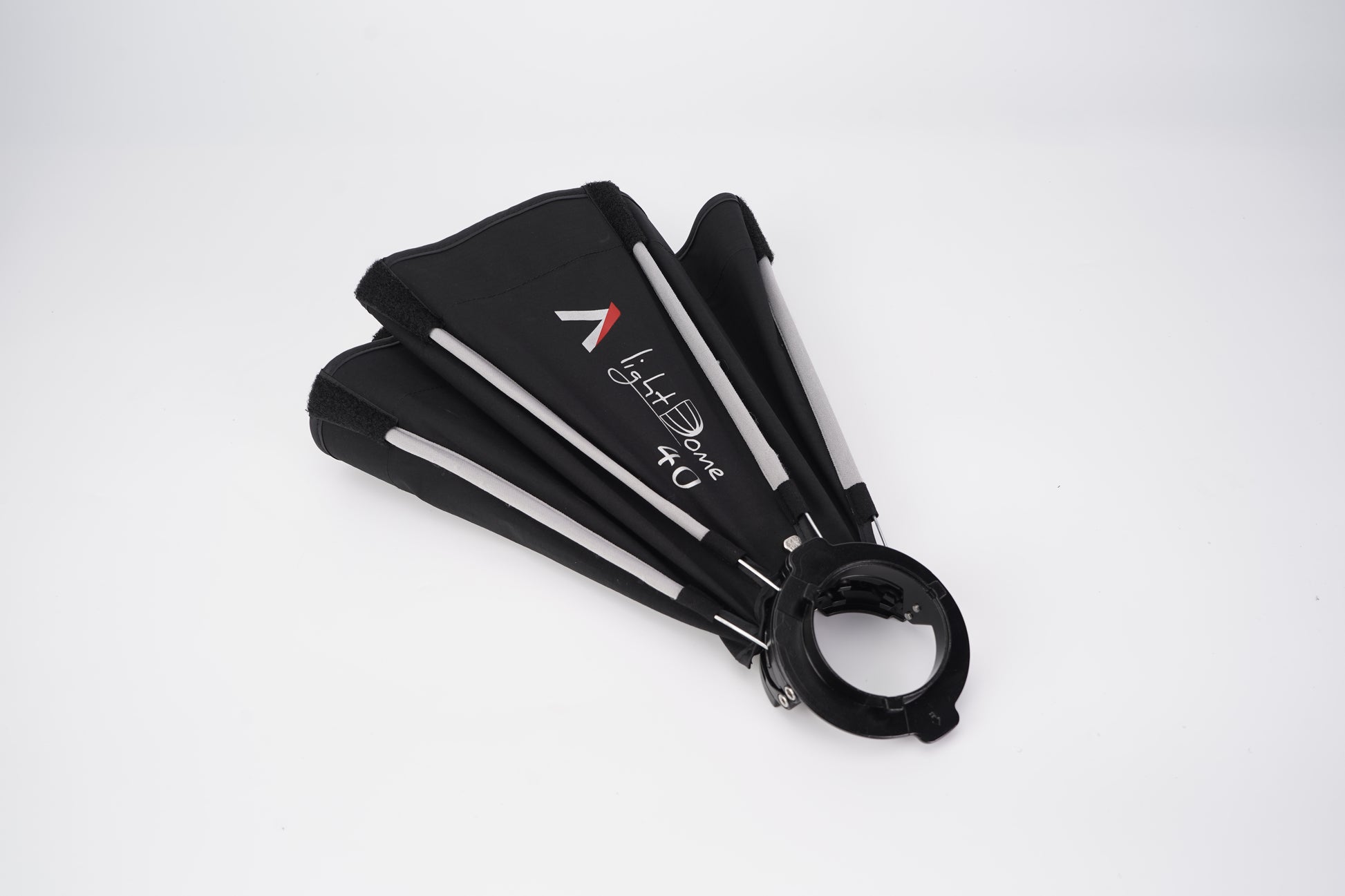 The Light Dome 40 is a round 8-corner mini soft box with a 40cm (15.75in) light surface diameter and a Mini ProLock mount ideal for usage with the STORM 80c. Featuring a highly reflective silver lining and deep parabolic design, the Light Dome 40 gives users maximum output with uniform edge-to-edge illumination. With a quick-release latch design, the Light Dome 40 can be quickly deployed or torn down without having to individually snap support rods in place. Included with the soft box are a 1stop diffusion cloth, 2-stop diffusion cloth, 45º light control grid, and a soft carrying bag.