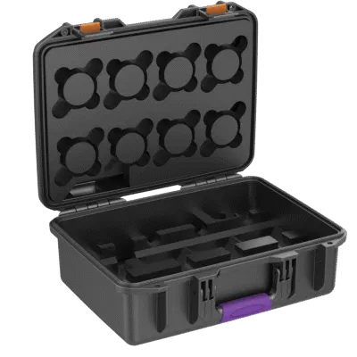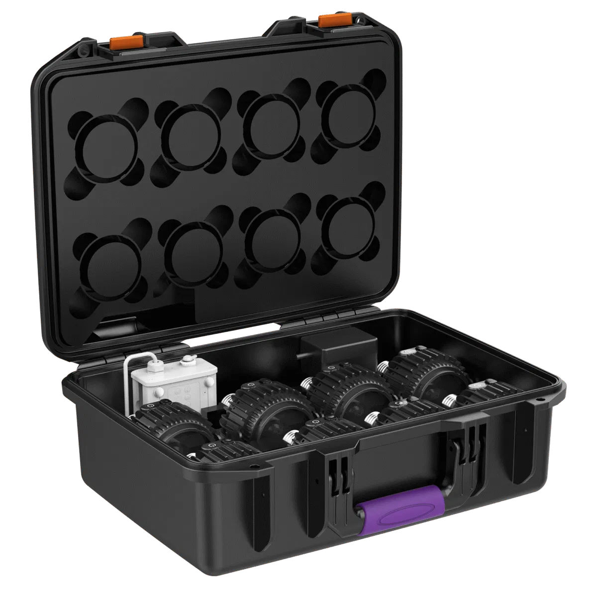 Set of 8 SolaBulbs, 8 SolaSnoots, and 1 PowerStation with charger, stored in a durable protective plastic case. The PowerStation functions both as an external battery and as an external display.