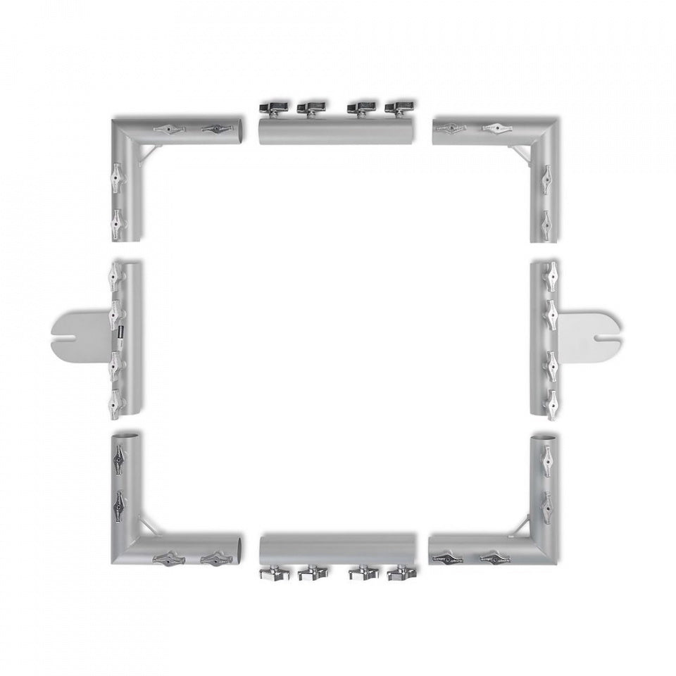 The H9000 D.I.Y. Butterfly Pipe Corner Kit allows the possibility of making frames of any dimension. The kit comes complete with 4 corners, 2 straight pipe connectors with ears and 2 straight pipe connectors without ears. The nominal bore of this flexible butterfly pipe corner kit is 1.5 inches/3.8 cm. Aluminum Speed rail piping is what is used to customize the size of this butterfly kit. The outer dimension of the corners and pipe connectors is 1.9 in/48.3 mm. This size is very popular in the UK and the European markets. 1.5 in speed rail can be found in the North American market but the preferred size is 1 1/4 in.