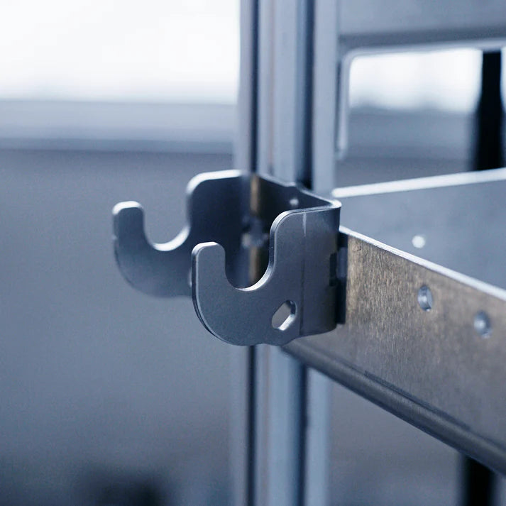 An individual combo stand hook. Bolt it to an existing cart, fit it into E-track, onto aluminum extrusion or screw it into wood. Suitable for use in production vehicles.
