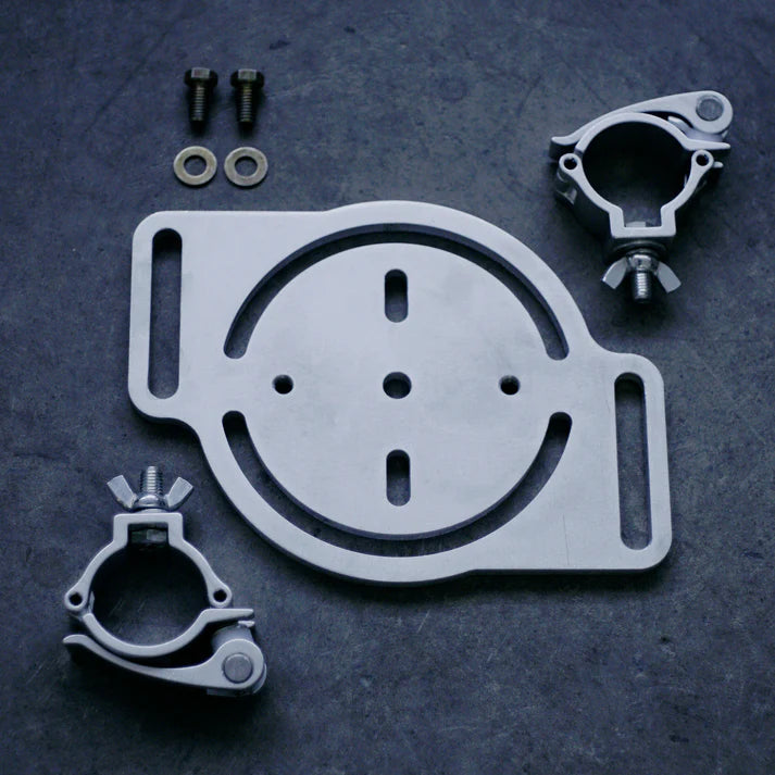 The Happy Face Camera Mount interfaces with any 2" (50mm) pipe, for versatile overhead camera rigging. The slots allow for fine angle adjustments without having to lift or lower the supporting stands. Can be used with either single or double pipe set-ups for extra stability.