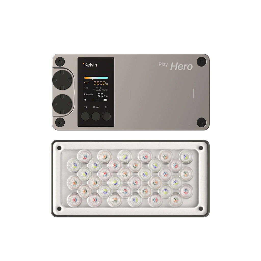 Illuminate your vision with Kelvin Play Hero, an advanced RGBACL LED pocket light offering unmatched brightness, precision, and versatility. Powered by Kelvin’s patented RGBACL technology (Red, Green, Blue, Amber, Cyan, Lime),this compact powerhouse ensures flawless color mixing, outstanding skin tone accuracy, and superior output across the 1700K-20,000K range. Designed for filmmakers, broadcasters, and photographers, Play Hero sets anew standard for professional-grade lighting in a portable package and outperforms competitors in brightness, durability, and color accuracy.
