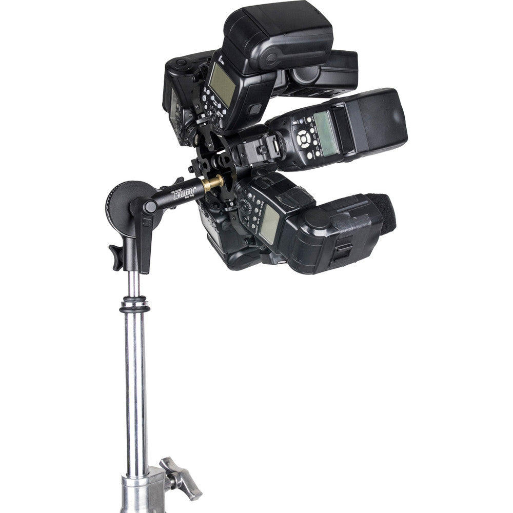 The Kupo Bagua Multi-Flash bracket is a palm sized, lightweight, black anodized, 6061 aluminum bracket with eight speedlight mounting locations. The bracket will accommodate four speedlights on it's own or up to eight speedlights with some optional Extension Flash Adapter Set.
