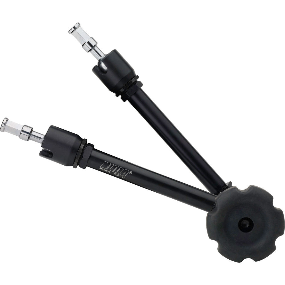 The Max Arm is an adjustable arm that allows you to position a camera lighting fixture or accessory in any position within seconds! The two 5/8" (16mm) studs at either end are attached to ball joints that rotate 360 degrees plus a cut-out in the sleeve surrounding the ball allows the stud to be bent 90 degrees. One stud is tapped to receive a 3/8"-16 thread while the other is tapped to receive a 1/4"-20 thread. Each stud has six milled flat surfaces so whatever you mount on the Max Arm will not rotate. The central elbow rotates 360 degrees for infinite adjustability. The Max Arm is equipped with user-replaceable special friction discs with anti-slip rosettes prevent unwanted movement. The large rubberized hand wheel slowly increases tension until all three joints lock at once making precise positioning a breeze. Supports loads of up to 8.8 lbs (4 Kg) Black Aluminum FinishShare