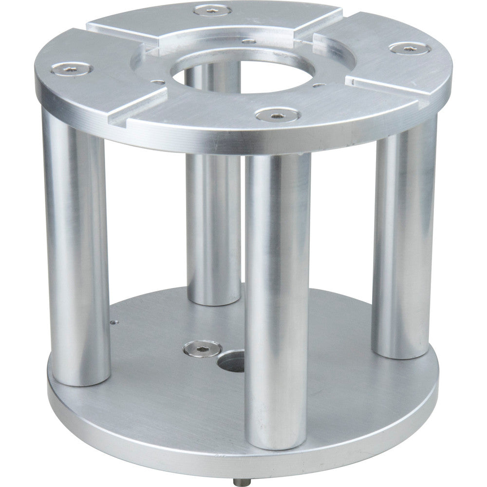 The Mitchell 6in high camera riser is assembled with Mitchell female mounting configurations on top, Mitchell male mounting configurations on the base, and three solid aluminum rods measuring 20mm in diameter. The Mitchell 6in Camera Riser raises the camera and head a fixed distance off the dolly or support piece.