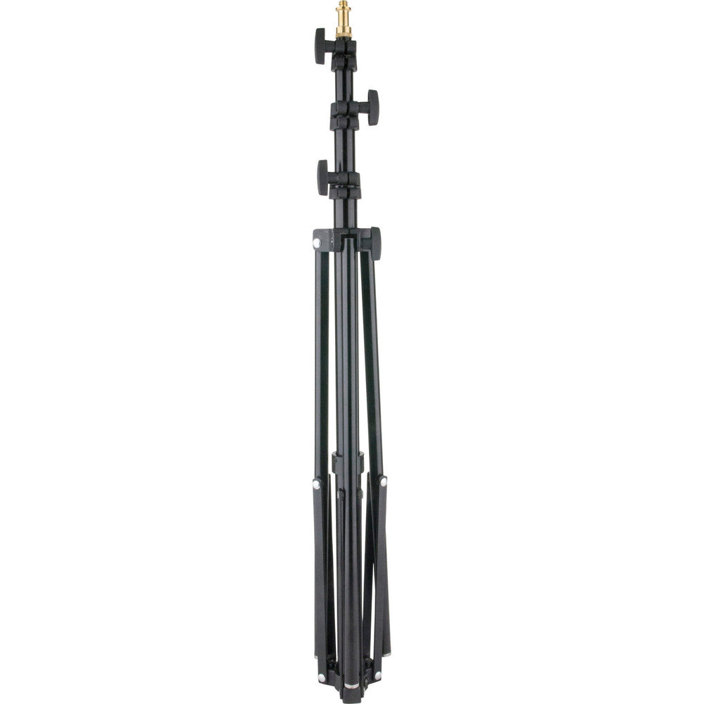 The Kupo Single Handed Stand is a 8' aluminum lightweight kit stand essential for the solo location photographer. As the name implies, all you need is a single hand to operate this stand. Simply grab the main riser section, lift the stand off the ground and the legs will collapse automatically. To open, just place it on the floor, the legs will open and you can let go. This action does make a little noise, so a locking knob was added so the legs will remain in the open position when the stand is lifted when absolute quiet is required. When finished this stand folds up to a compact 29".