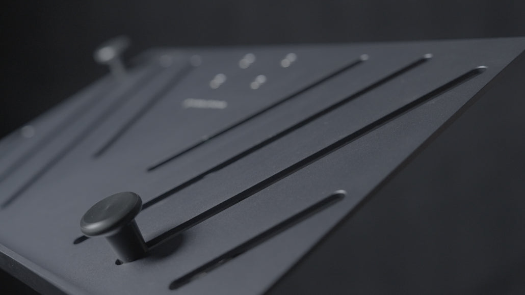 The two mushroom shaped knobs on the platform that can be positioned to hold any sized laptop or tablet.