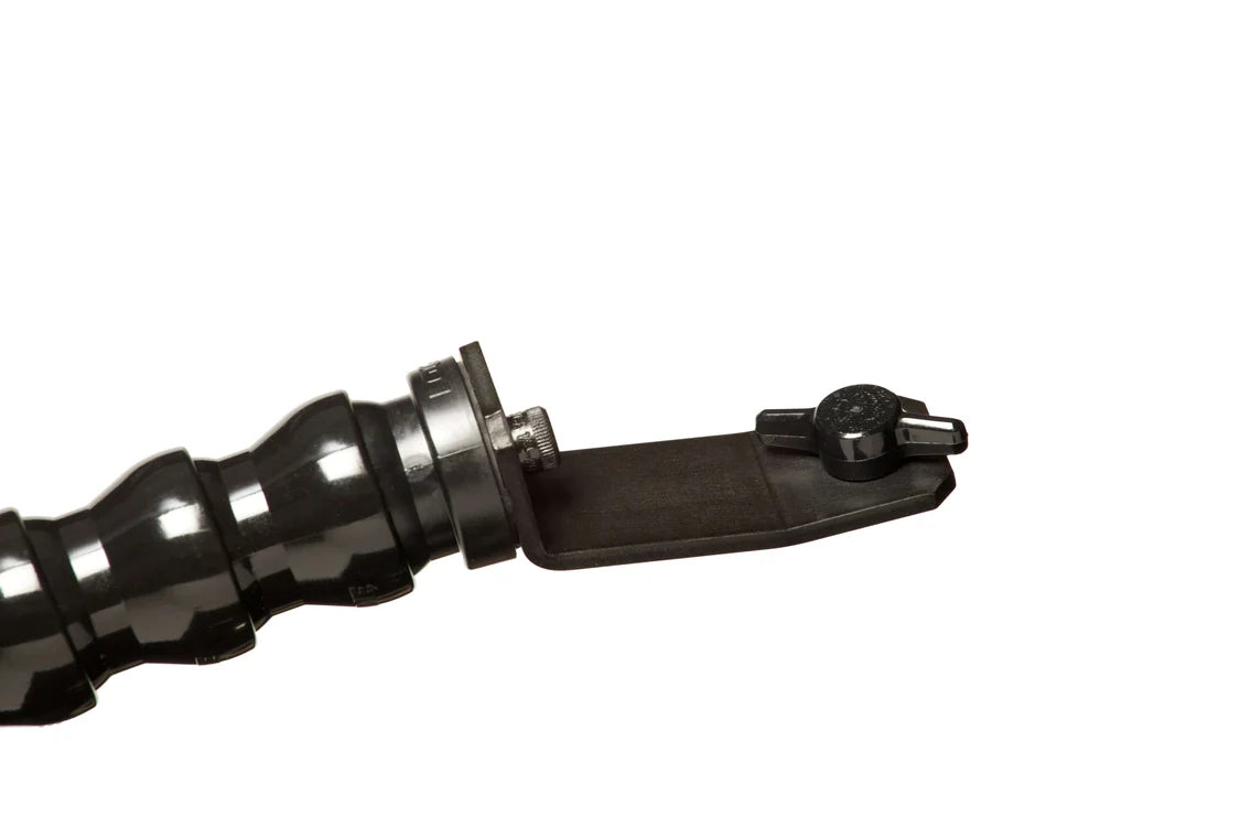 Dinkum Systems® PRO™ Fixed Base Mount is the “french flag” of choice for shooters who prefer a lens shade affixed to the handle of their camera. Used on shoots in some of the most remote and harsh environments on the planet, the PRO™ helps keep your lens free of sun, dust and drizzle. It features a 10” anti-reflective aluminum shade supported by a 13-segment, 14-inch, multi-directional, length-adjustable arm. Designed for use with shoulder-mount cameras, this medium-size shade secures to the ¼”-20 female thread on the handle of professional cameras and provides a low profile with uninterrupted handgrip. Check out a video of how our system works HERE. Optional bases: The original Clamping Mount features a surprisingly strong plastic clamp with 1.5”-wide rubber-coated jaws and pivoting rubber tips which ensure a solid base, while enabling multiple points of attachment. No tools required to interchange parts: simply pop apart, and press back together! The Screw Mount is a base that attaches to the threaded receptacle on your accessories block, camera handle or female-threaded mini-Cardellini clamps - providing secure fastening to all standard ¼-20" attachment points. No tools required to interchange parts: simply pop apart, and press back together! Make your lens shade do double duty as a mount or grip device with our range of interchangeable heads and bases, designed to meet all sorts of on-set challenges. Specs: flag is aluminum 10”x 6½”, 13-segment arm is 14” long, standard ¼”-20 male (tripod size) thumbscrew. Weight 12.3 oz.