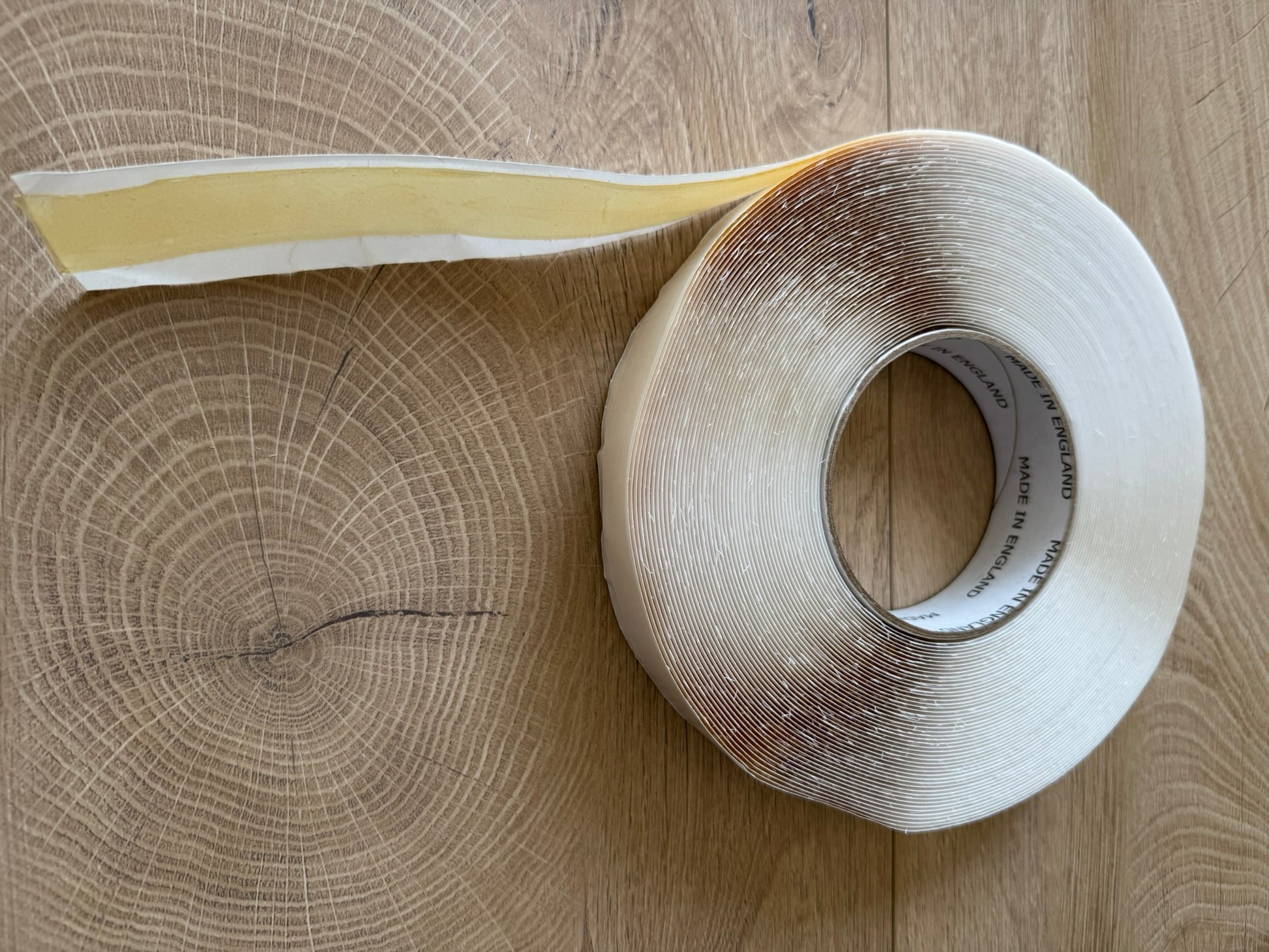 Clear Butyl (aka Snot Tape), also known as the English Butyl as it is made across the pond. Used widely by Prop and Set Dressing Departments for securing items to shelves, walls and tables for continuity and safety. Sticky throughout. Its pliability gives it the ability to be used in a variety of ways. Clear and Non-Staining.