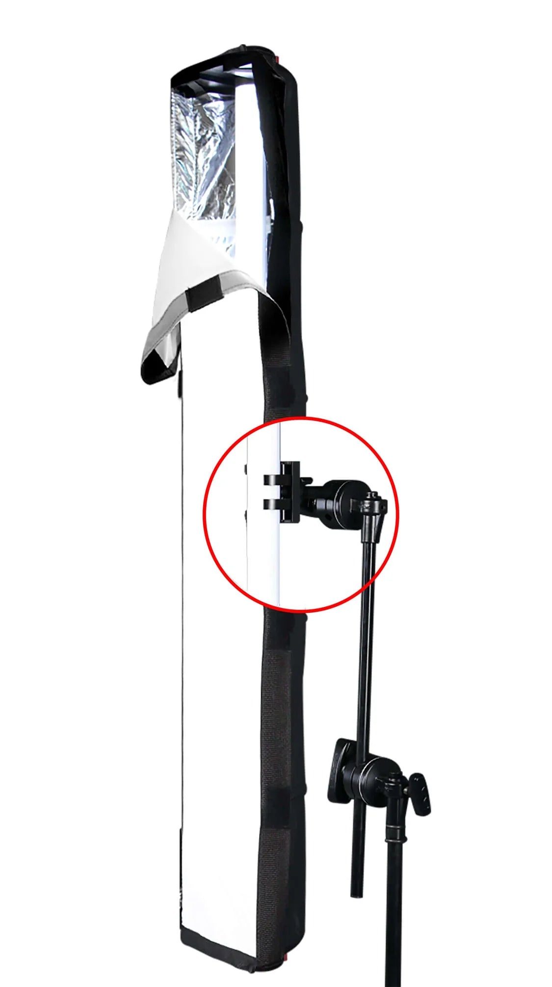 The VeeBoxx includes three removable front panel diffusion options including the Voodoo Cloth, a 1/2 Grid (Lite), and a 1/4 Grid for versatile lighting options. The lightweight black ripstop nylon body prevents light loss, and strategically placed internal and external hook and loop fasteners secure the panel to the body and allow for control grid attachment. The reflective silver interior maximizes light output, and a rear zippered opening runs the length of the body to allow access to the tube controls. The Claw light clamp is included and can be attached anywhere you require. The VeeBoxx folds up accordion-style for easy transport.